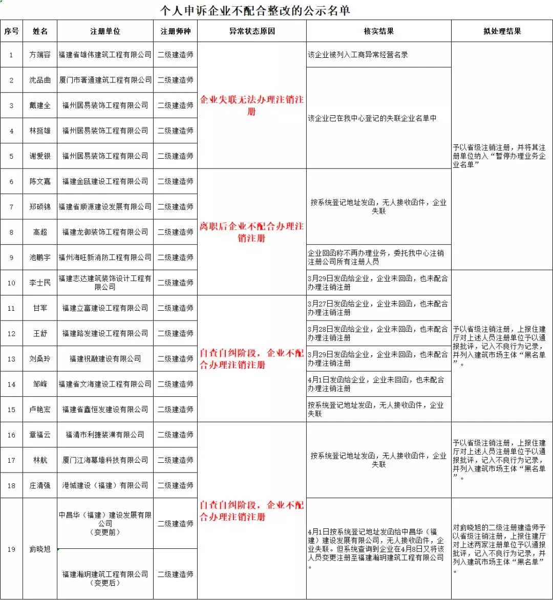 根据《关于印发<福建省开展工程建设领域专业技术人员职业资格“挂证”等违法违规行为专项整治实施方案>的通知》(闽建筑函〔2019〕11号)文件要求,2019年1—3月为企业和个人自查自纠阶段,企业和个人应在此期间针对挂证问题及时自行整改,但部分企业或个人仍未配合进行自查自纠。